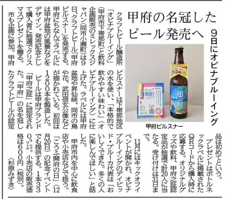 甲府之証 認定!「甲府ピルスナー」発売しました!〈山梨日日新聞に掲載されました〉